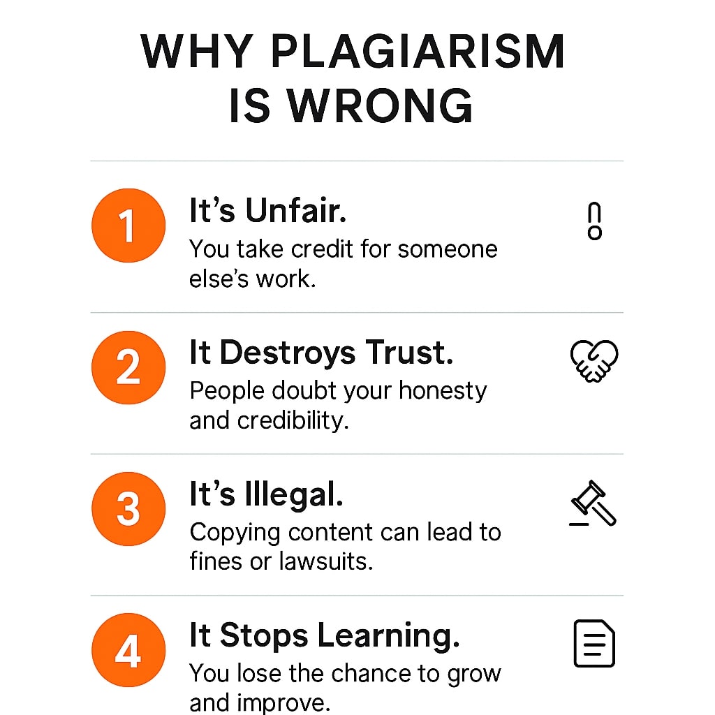 Plagiarism isn’t just “borrowing.” It has real implications. Below are the main reasons why copying someone else’s work is not a good practice: